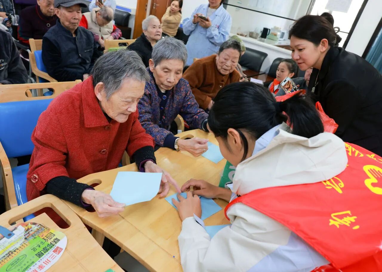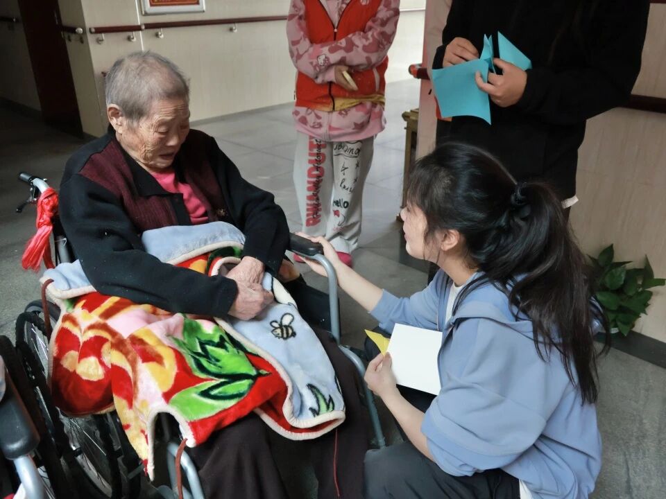 互动环节的每一个细节,都写满了志愿者们的用心。一折一叠间,彩纸在指尖焕发生命,化作满载祝福的千纸鹤与百合;一问一答中,倾听与陪伴温暖了时光,驱散了长辈的孤单。一捶一捏中,轻柔的力道恰到好处,舒缓了积年的疲惫;一言一语里,关切的问候无微不至,传递了浓浓的敬老情。