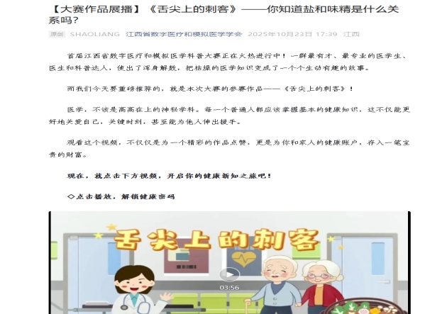 10月23日,江西省数字医疗和模拟医学学会通过官方公众号启动首届江西省数字医疗和模拟医学科普大赛首轮作品展播,南昌医学院健康管理学院2024级养老服务管理班王婉清、杨懿、张宇豪三位同学共同创作的作品《舌尖上的刺客》——你知道盐和味精是什么关系吗?成功入选,成为首批亮相的优质科普作品,展现了南医学子在健康科普领域的专业素养与创新能力。