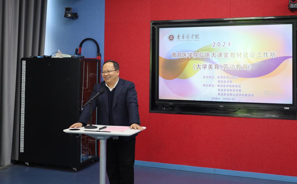 (通讯员童林)1月5日下午,南昌医学院2024年弘医大课堂教材建设工作坊顺利举办。南昌医学院党委委员、副校长叶耀辉出席并致辞。来自安徽师范大学、井冈山大学、江西师范大学、江西中医药大学、南昌航空大学以及高等教育出版社等多所高校和教育出版机构的20余名专家学者汇聚一堂,共同探讨大学美育与劳动教育教材建设路径方法。