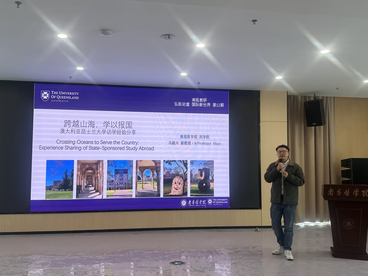 马越兴副教授现任药学院副教授、中草药栽培与鉴定教研室主任,长期从事地方特色中药、民族药等领域研究,2024 年 12 月至 2025 年 12 月赴昆士兰大学开展访问学者工作。分享中,他结合一年访学经历,从海外科研前沿、学术交流感悟、国际教学模式等方面,为师生们分享了宝贵经验与成长心得,为大家规划国际交流、深耕专业发展提供了清晰指引。