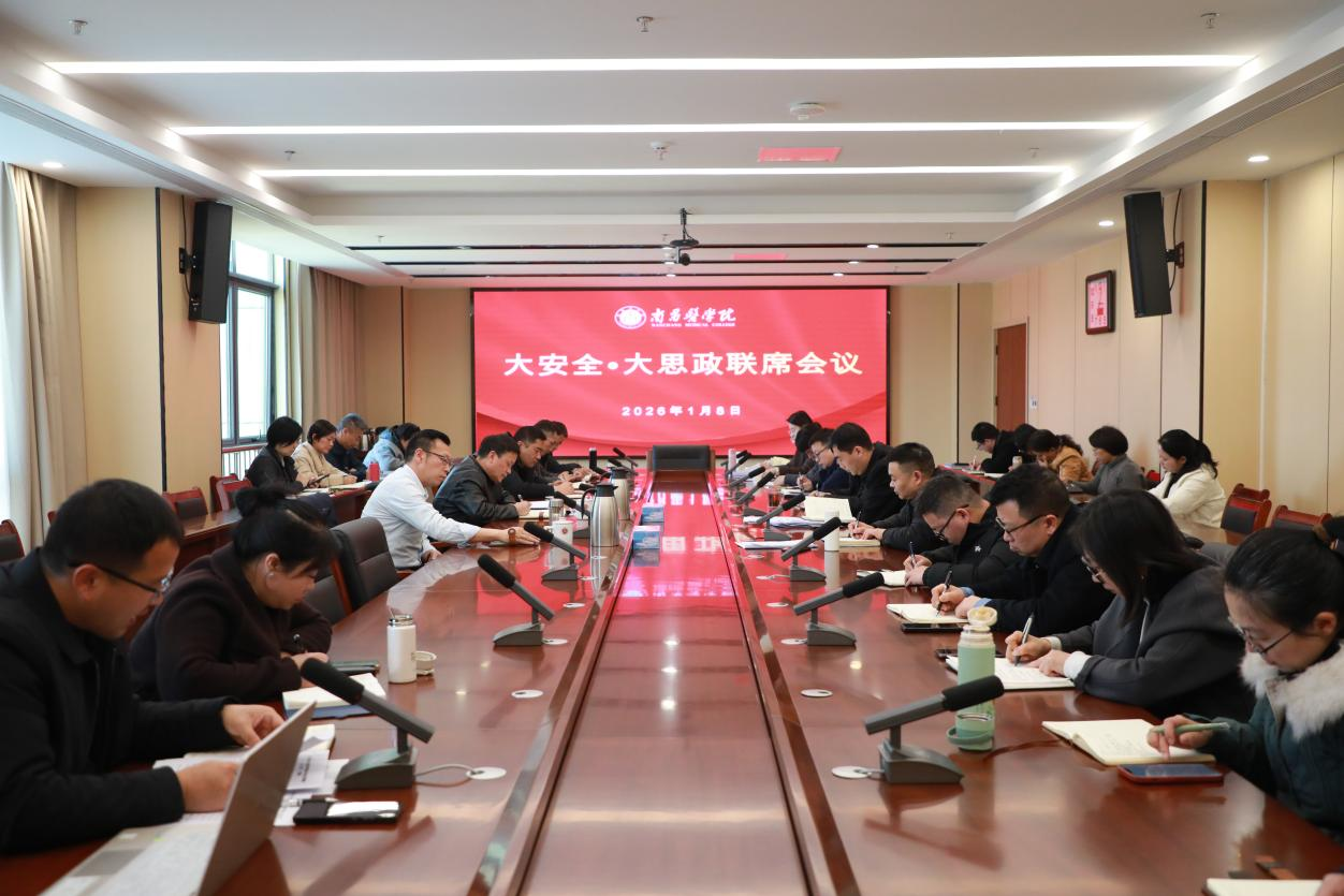 1月8日下午,学校在九龙湖校区综合楼529会议室召开2026年第1次“大安全·大思政”联席会议。校党委副书记彭维杰,党委委员、副校长赖国文出席会议并讲话。相关职能部门主要负责人、各二级学院党组织负责人参加会议。会议围绕贯彻落实总体国家安全观,进一步深化“大安全、大思政”工作格局,全面系统总结《南昌医学院2025年思想政治工作重点任务清单》《南昌医学院2025年平安建设工作重点任务清单》《南昌医学院2025年“大安全·....