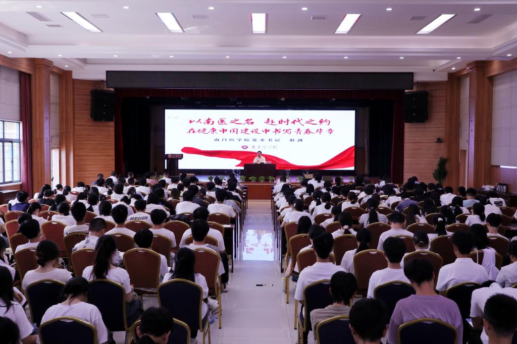 10月16日下午,南昌医学院党委书记殷剑在象湖校区学术报告厅为同学们讲授2025年秋季学期“思政第一课”,激励青年学子厚植家国情怀,勇担时代使命,彰显强国担当,在健康中国建设中书写青春华章。