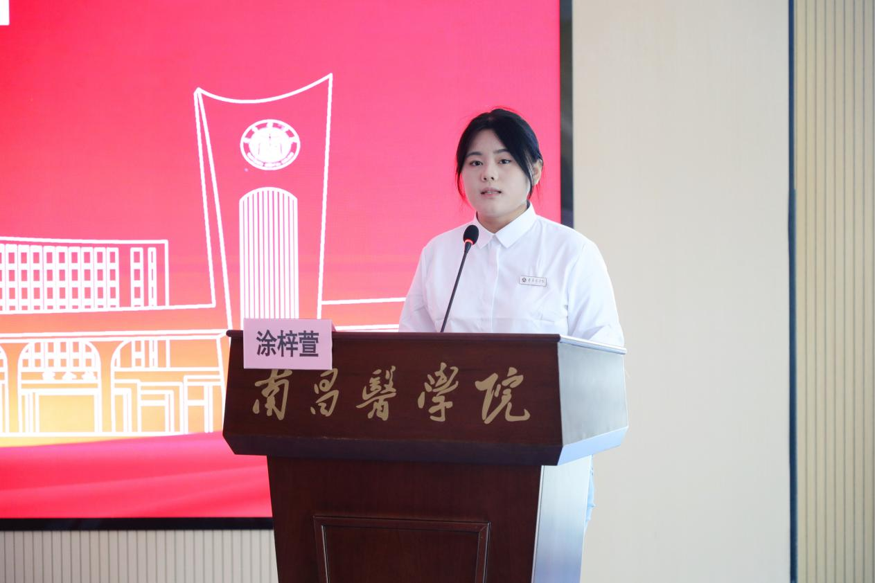 首期学员代表、中西医临床医学1班学生涂梓萱作代表发言。她分享了选择攻读中西医临床医学专业的初衷,表达了对精研医术的迫切需求,以及对未来学习的期待,展现了学员群体高度的学习热情和清晰的职业规划。