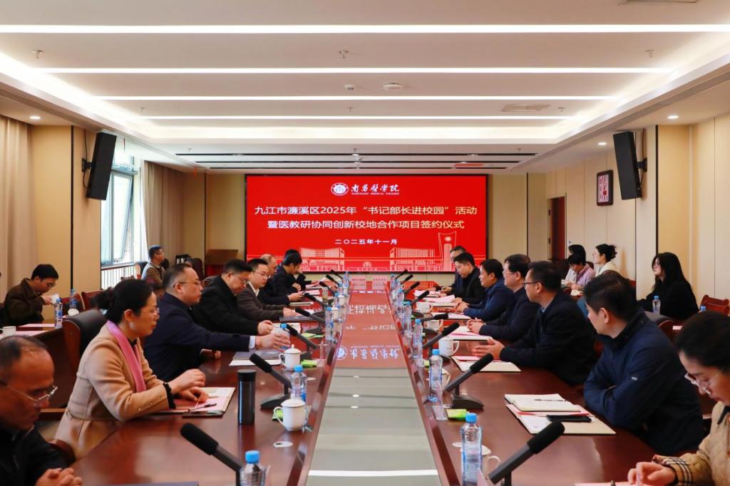 11月21日,濂溪区2025年“书记部长进校园”活动暨医教研协同创新校地合作项目签约仪式在南昌医学院九龙湖校区举行。南昌医学院党委书记殷剑,九江市濂溪区委书记、鄱阳湖生态科技城党工委书记赵和平出席仪式并致辞。南昌医学院党委副书记彭维杰,党委委员、副校长赖国文,濂溪区人大常委会副主任户国光,濂溪区政府副区长廖云剑出席仪式。濂溪区委常委、组织部部长李章波主持仪式。