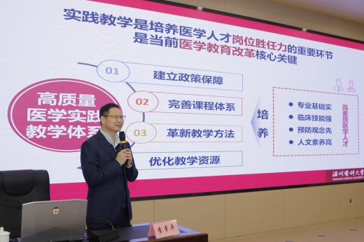在专题报告环节,右江民族医学院副校长王俊利围绕“新质生产力视角下基于现代产业学院培养高质量应用型医药人才创新探索”作交流分享;温州医科大学教务处处长李章平就“医教协同视域下高质量实践教学体系探索与实施”分享经验。两场报告系统阐释了现代产业学院建设与实践教学体系优化的路径,为学校深化教育教学改革提供了有益借鉴。