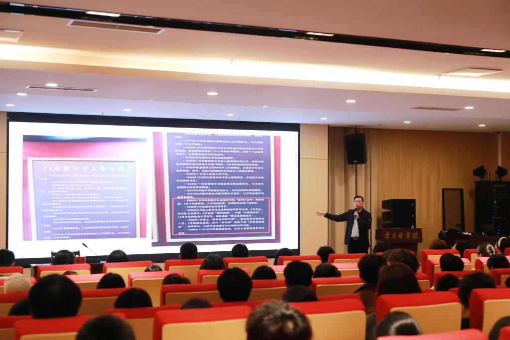 4月1日,学校党委副书记彭维杰以“纪念白求恩”为主题,为青年学生带来一堂深刻的思政团课。彭维杰以白求恩同志的生平事迹为脉络,从了解白求恩、精湛医术的锤炼、信念品德的养成、输血事业的贡献,到精神的传承与纪念,系统梳理了白求恩不远万里从加拿大来到中国、投身抗日救亡、救死扶伤、以身殉职的光辉一生,深入阐释了“毫不利己、专门利人、救死扶伤、精益求精”的白求恩精神的时代内涵与育人价值。