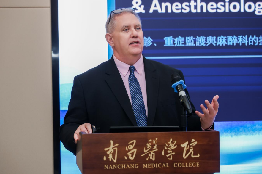 4 月 22 日,南昌医学院国际临床模拟教学高质量发展研讨会在九龙湖校区举行。特邀两位国际权威专家美国匹兹堡大学 WISER 模拟医学中心主任保罗・弗兰普斯教授、副主任约翰・奥唐奈教授作主旨报告。南昌医学院党委副书记、校长李秋根,北京华通国康公益基金会理事长陈冉出席开幕式并致辞,党委委员、副校长叶耀辉主持开幕式。学校及附属医院相关部门负责人、临床教师代表及骨干教师参加会议。
