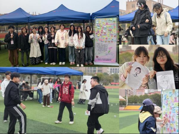 3月25日,大学生心理健康服务中心在象湖校区田径场举办了“3·25抑郁症科普宣传日”线下互动活动。活动设置“丢弃烦恼”(沙包投掷)、“踢去忧伤”(毽子接力)、“暗影同行”(双人协作)及“共情肖像画”四个主题体验环节,累计吸引200余名同学到场参与,在每个互动环节中,工作人员耐心讲解抑郁症相关知识,围绕抑郁情绪与抑郁症的区别、常见认知误区、自助与求助方法等内容进行科普介绍,帮助学生在游戏体验中掌握科学的心理调适方法。